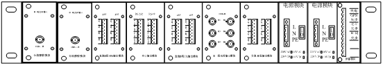 每臺機箱后面板配有2塊輸入模塊,2塊電源模塊,10塊輸出模塊和1個告警模塊;