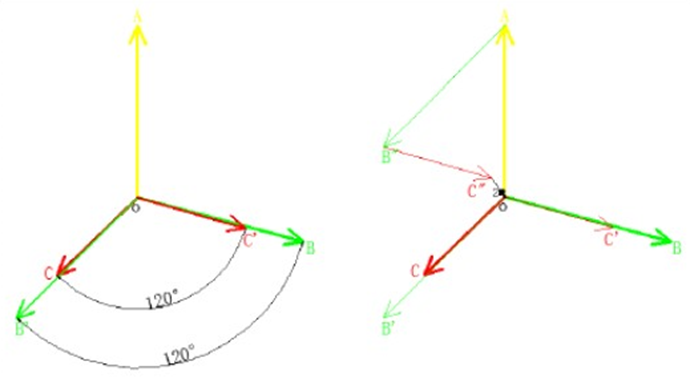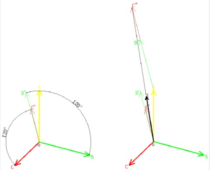 2)  求正序分量:對原來三相向量圖先作下面的處理:  A 相的不動, B 相逆時針轉 120 度,C 相順時針轉 120 度,因此得到新的向量圖。按上述方法把此向量圖三相相加及取三分一, 這就得到正序的A 相,用 A 相向量的幅值按相差120度的方法分別畫出B、C 兩相。這就得出了正序分量。